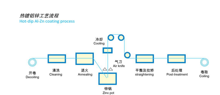 熱鍍鋁鋅鋼板是以各種強(qiáng)度和厚度規(guī)格的冷軋鋼板為基材,在雙面熱鍍一層AI-Zn鍍層所得的預(yù)鍍層鋼板,鍍層成分中質(zhì)量百分比約為55%的Al、1.6%Si,其余成分為鋅,融合了AI的物理保護(hù)和高耐久性以及Zn的電化學(xué)保護(hù)特性。此外,在表面呈具有高裝飾性的光亮銀灰色澤及規(guī)則的花紋,并具有浮凸感。